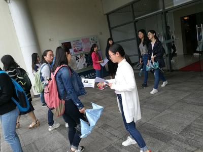 为了让更多的同学知道并参与进来我们的活动,工作人员们积极地派发传单,向感兴趣的同学讲解我们的活动。