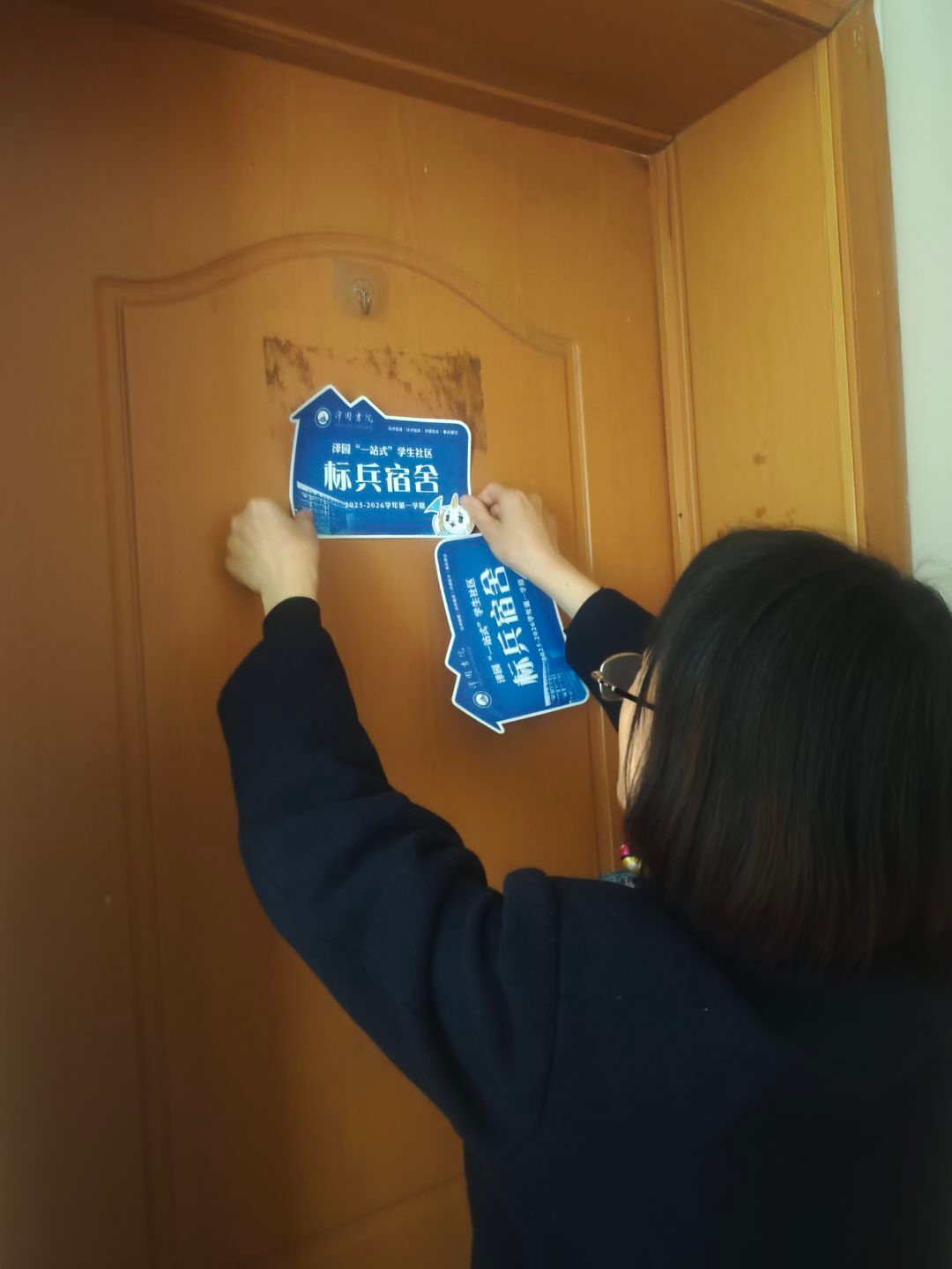 张贴现场暖意融融,洋溢着喜悦与温馨。泽园书院学生社区服务中心的学生干部与四个站区的宿管员提前做好了充分准备,仔细核对着每一间标兵、文明宿舍的名单,确保信息准确无误。张贴过程中,大家动作轻柔细致,小心翼翼地抚平、贴正每一张荣誉贴纸,用一份郑重守护每一份荣光。不少同学得知消息后也主动来到现场,与宿管员并肩协作,亲手为宿舍贴上这份专属的骄傲。大家分工合作,有的递贴纸,有的调整位置,在欢声笑语中定格下一个个温暖而又有意义的瞬间。小小的举动里,写满了对集体荣誉的珍视。