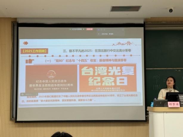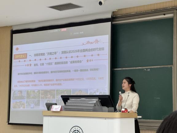 本次理论课,顾梦佳老师以宏阔的经济发展视角,系统回顾了2025年我国经济发展、科技创新等方面取得的显著成就与“十四五”圆满收官的丰硕成果,深入解读2026年全国两会的时代意义与核心议题,围绕新质生产力、民生保障、人工智能治理以及“投资于人”“中国服务”等关键新提法进行阐释,并全面解读“十五五”规划蓝图,强调要聚焦高质量发展、国内大循环、共同富裕、统筹发展和安全等重点任务,引导青年学员坚定理想信念,将个人成长融入国家发展大局,勇担新时代青年使命。