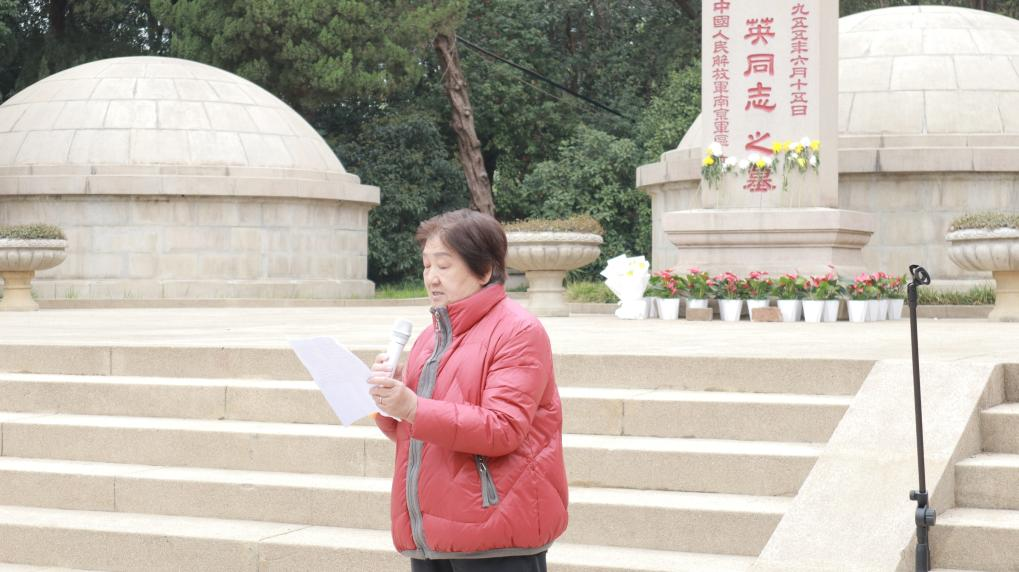 首先,江苏省新四军研究会五师分会会长赵晓宁发言。她深情介绍三烈士墓七十周年祭奠活动的筹备背景和历史意义。她指出,三位烈士在皖南事变中展现出的坚定信仰和大无畏精神,是中国共产党人“为有牺牲多壮志,敢教日月换新天”牺牲精神的生动写照。她勉励在场师生,要以先烈为榜样,居安思危、迎难而上,将革命精神转化为实际行动,号召青年一代扛起“走在前、挑大梁、多做贡献”的时代责任,为实现中华民族伟大复兴贡献青春力量。