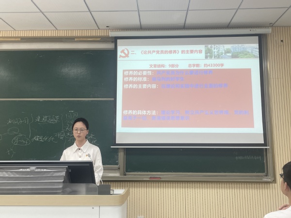 党日活动第一环节聚焦理论学习,围绕刘少奇同志《论共产党员的修养》展开专题党课。支部书记凌彤从著作的历史背景切入,指出该书诞生于抗日战争时期思想建设的关键阶段,新入党分子需要加强党性教育、老党员仍要克服非无产阶级思想、党内的斗争和团结问题突出等党内存在的这些问题促使刘少奇深入思考并提出了共产党员要加强修养的理论和实践问题。陈珂同志系统梳理全书脉络,带领党员深入思考了共产党员为什么要修养、在哪些方面进行修养、怎样修养等问题。周梓钰同志结合新时代要求,从“新使命、新征程、新挑战、新情况”四个维度剖析该著作的当代价值,提出“党性修养是终身课题”的鲜明观点,号召全体同志以自我革命精神锤炼政治品格,永葆初心本色。